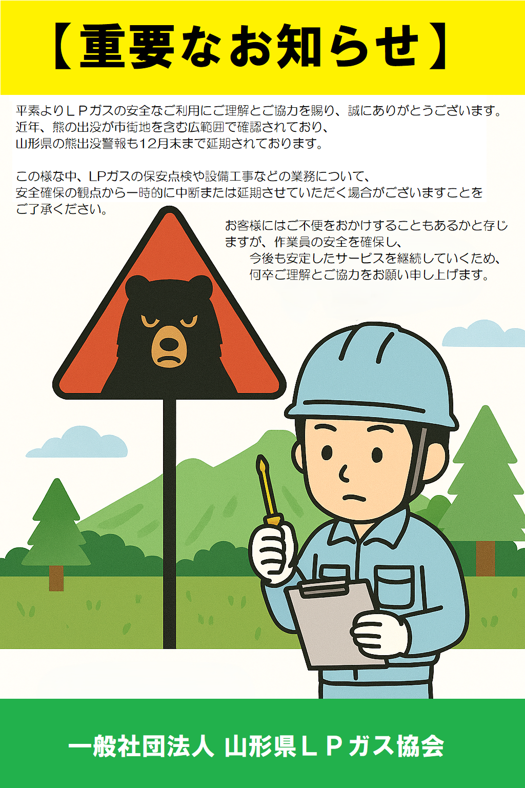 熊被害の頻発化に伴うLPガス業務への影響について(お知らせ) 投稿日: 2025/12/022025/12/01 投稿者: lpg-admin LPガスの安全なご利用にご理解とご協力を賜り、誠にありがとうございます。 例年にない熊被害が報告される昨今、東北各地方ではLPガス業務に支障をきたす状況も発生しております。 山形県でも熊出没警報が12月末まで延長されるなど、未だ予断を許さない状況に置いて、LPガスの保安点検、配送作業、設備工事など、安全確保の観点から一時的に中断または延期させていただく場合がございますことをご了承ください。 お客様にはご不便をおかけすることもあるかと存じますが、作業員の安全を確保し、今後も安定したサービスを継続するため、何卒ご理解とご協力をお願い申し上げます。